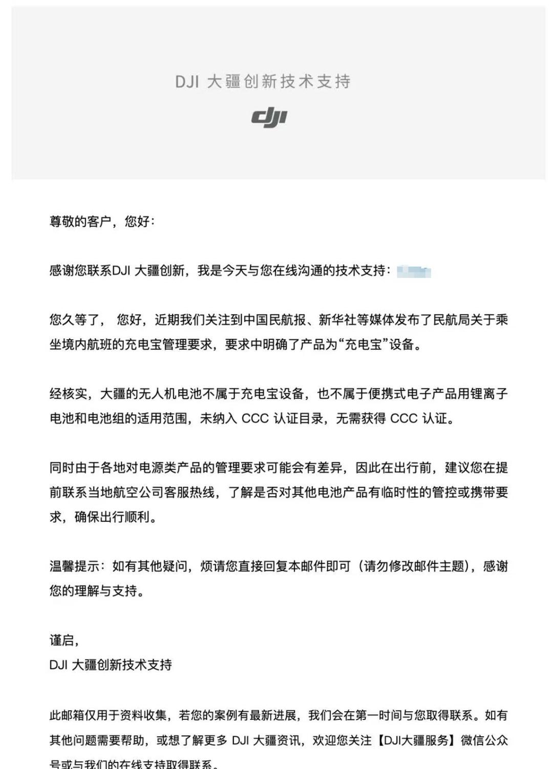 6月27日,揚子晚報/紫牛新聞就此事咨詢了大疆客服。工作人員回復稱,大疆產品電池不屬于充電寶設備,也不屬于便攜式電子產品用鋰離子電池和電池組的適用范圍,未納入CCC認證目錄,無需獲得CCC認證。由于各地對電源類產品的管理要求可能會有差異,建議提前聯系當地航空公司客服熱線,了解是否對其他電池產品有臨時性的管控或攜帶要求,確保出行順利。