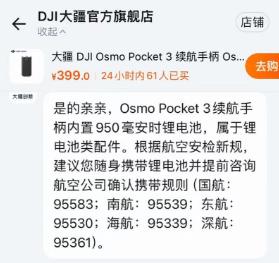 針對網友熱議的“Pocket3續航手柄”究竟屬于充電寶還是電池,大疆客服人員表示,該產品內置950毫安時鋰電池,屬于鋰電池類配件,不能為手機充電。