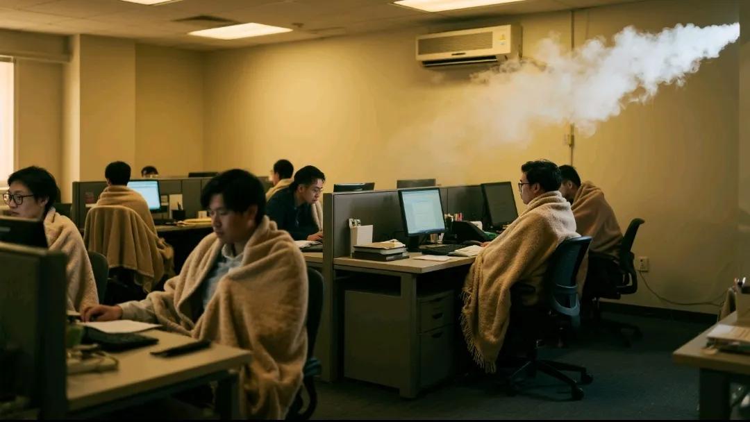 辦公室更絕,空調開得跟冰窖似的,我們裹著毛毯敲鍵盤,外賣小哥推門進來時眼鏡上瞬間結了層霧,他抹了把臉說:“你們這是在搞兩極分化實驗啊?”有次打印機過熱罷工,同事拍著它的“腦袋”勸:“哥們兒忍忍,等下班帶你去吃冰棍兒。”