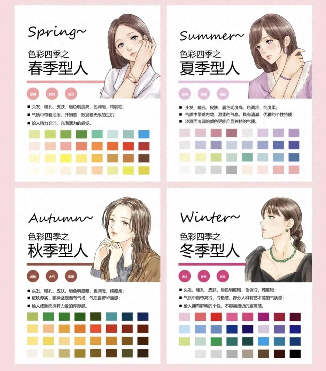 這句話里面的春夏秋冬,不是什么氣候知識(shí),而是近年來被不少明星、網(wǎng)紅打卡過的“色彩診斷”。它主要通過分析個(gè)人膚色、發(fā)色和瞳孔顏色之間的關(guān)系,再結(jié)合色彩學(xué)從而劃分出不同的類型,大的分類是4類——春季型、夏季型、秋季型、冬季型。