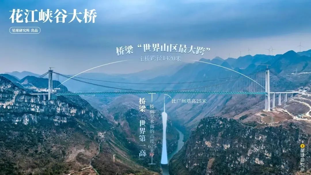 作為貴州省“交通+旅游”融合發展的重點項目,花江峽谷大橋全長2890米,主跨1420米,橋面至水面高差達625米,建成后將刷新山區橋梁跨徑及高度的世界紀錄。