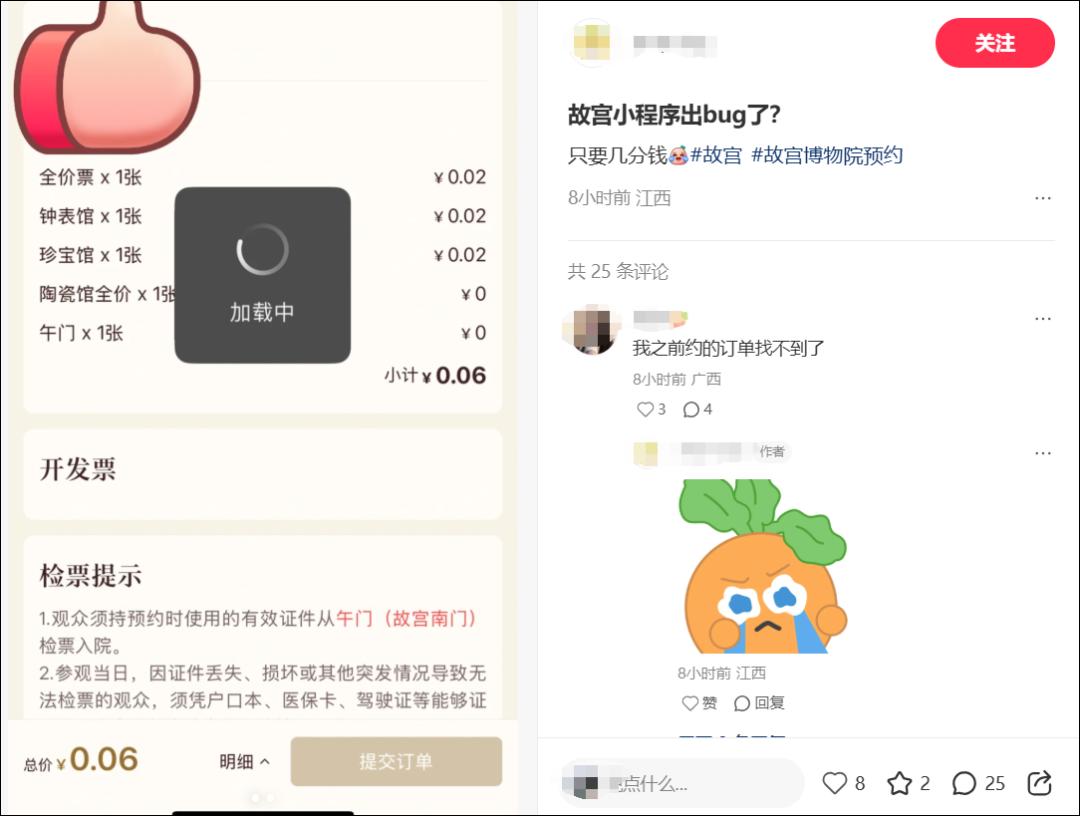 7月22日凌晨,部分網(wǎng)友反映“故宮小程序出bug”,2分錢就可以買一張門票: