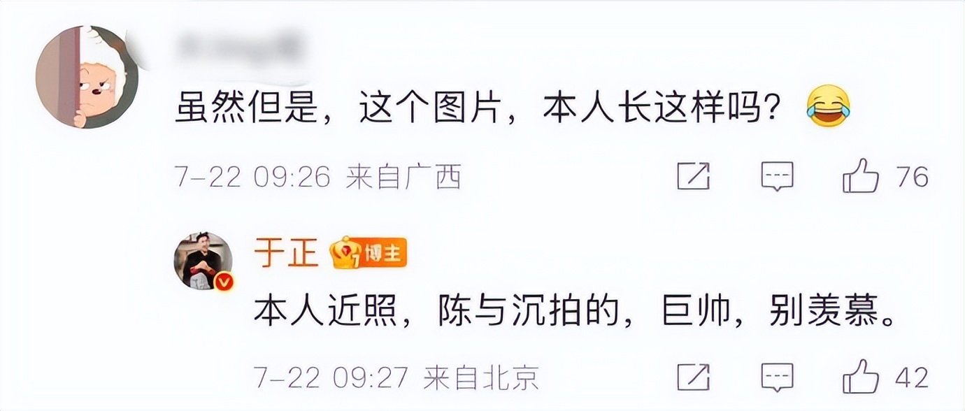 評論區直接炸開鍋。有人當場質疑:“這圖片是本人嗎?”于正親自下場回復,自信滿滿:“本人近照,巨帥,別羨慕。”
