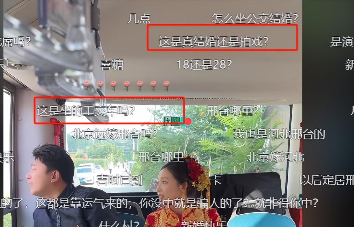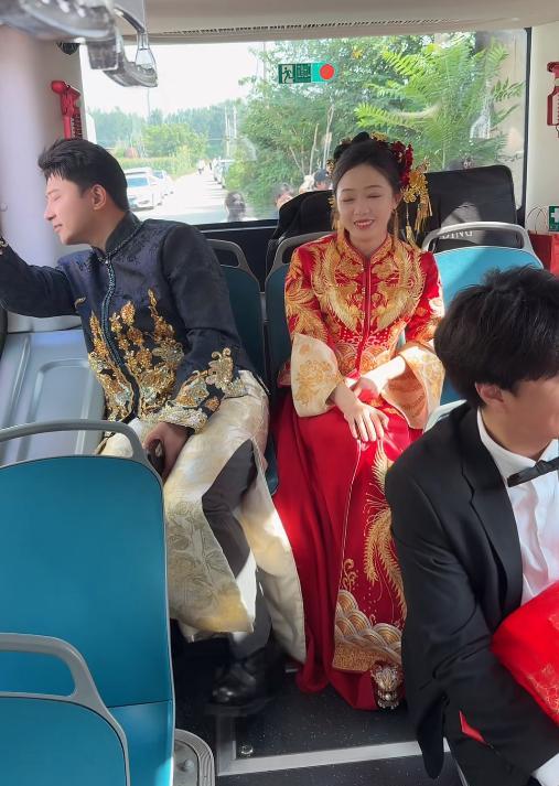 婚禮選在森林公園辦。早上7點,直播就開始了,挺早的。婚車沒用常見的豪華車隊,是輛帶著廣告的公交車,看著有點隨意。