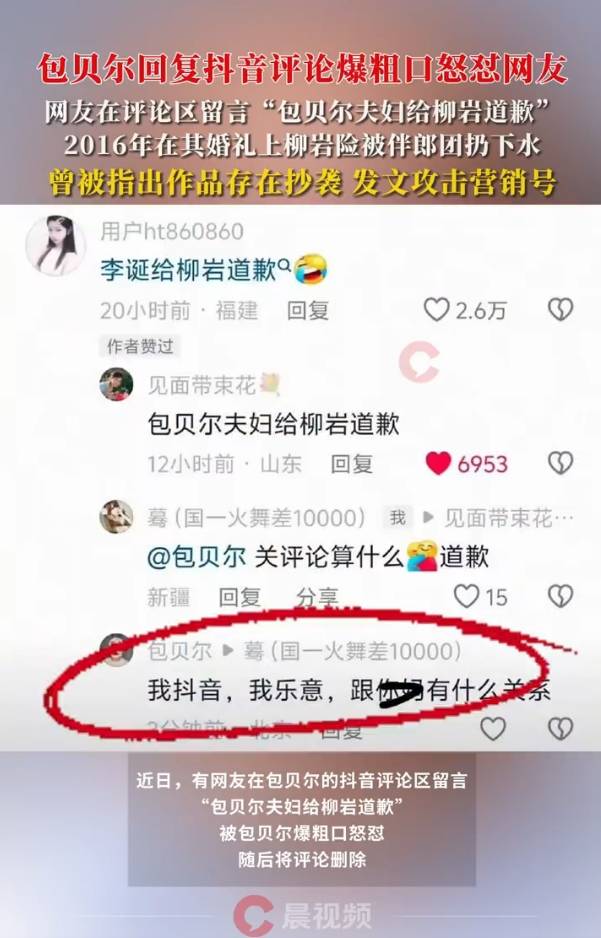 近日,有網友在包貝爾的抖音評論區留言“包貝爾夫婦給柳巖道歉”,被包貝爾爆粗口怒懟,隨后包貝爾將評論刪除。