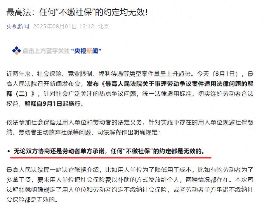 為什么呢?因為最高法出了一個規定,任何“不繳社保”的約定均無效。說用人單位必須給勞動者繳納社保,即便是勞動者自愿放棄也不行。
