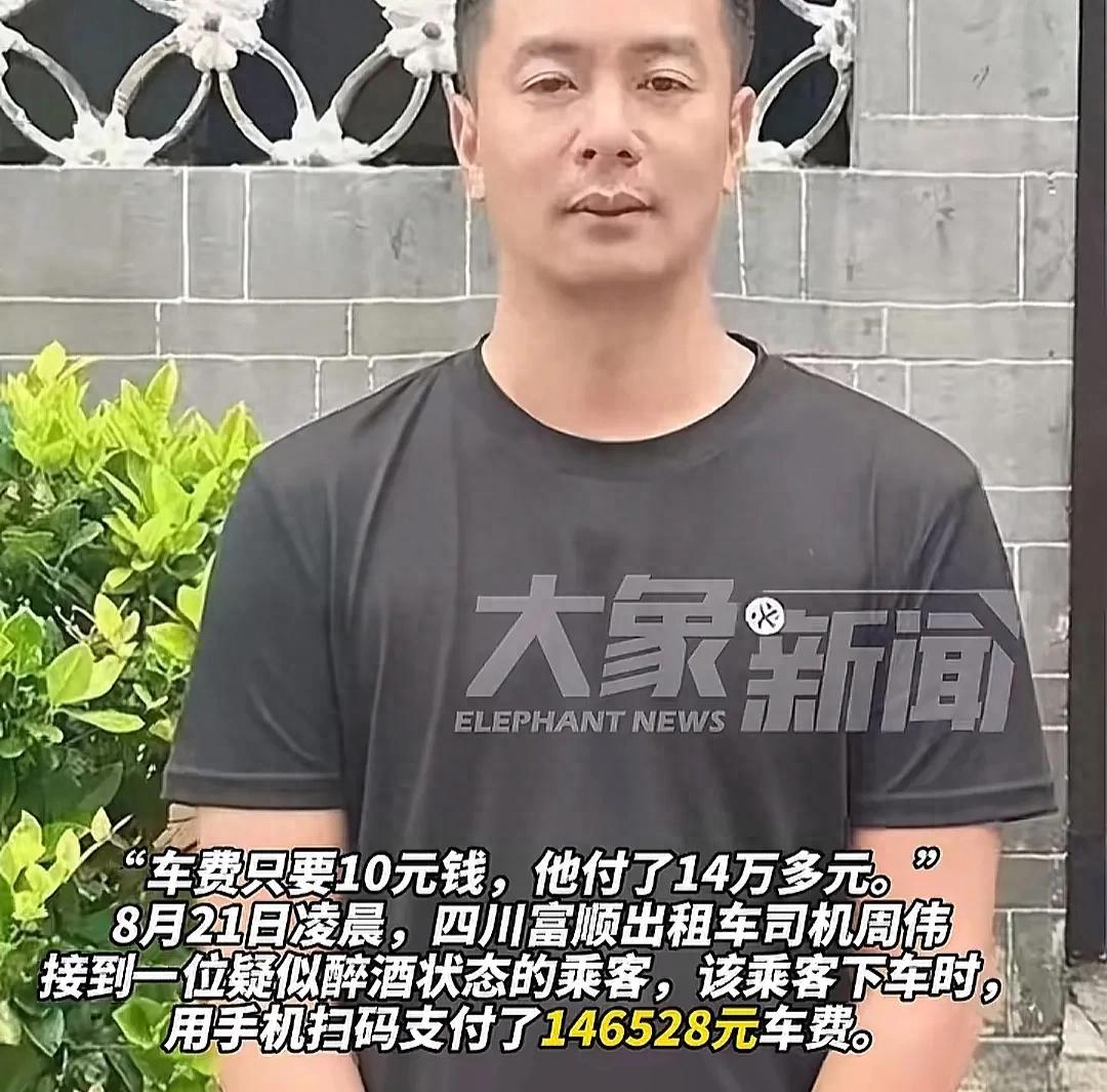 根據媒體的報道,四川富順出租車司機周師傅,在8月21號凌晨接到了一位醉酒乘客,還沒有到達目的地,在車輛行駛到大橋的橋頭處,男子就要下車,當時車費顯示的是10元,男子就用手機掃碼支付,周師傅的提示音提示“到賬14萬”。