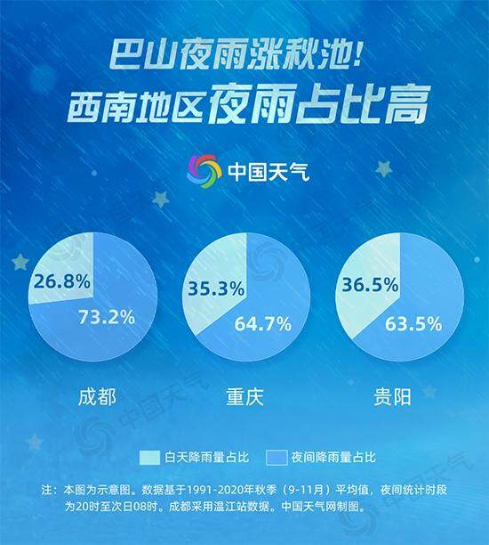 1100多年前的一個秋雨夜,客居異鄉(xiāng)的詩人李商隱寫下“巴山夜雨漲秋池”,說的就是華西地區(qū)多夜雨的特點。氣象大數(shù)據(jù)也證實了四川、重慶一帶的夜雨概率確實很高,多地六成以上降雨量出現(xiàn)在夜間。