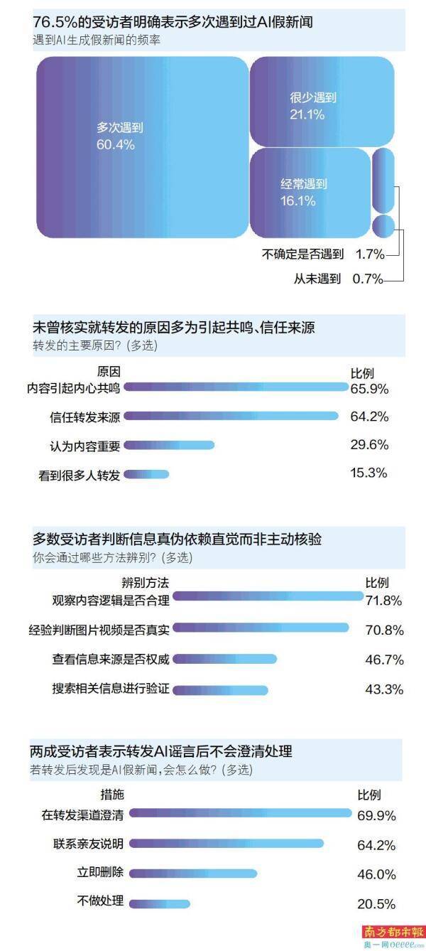 值得一提的是,報告還通過街頭實驗與問卷調查,以AI假新聞為例深度解析其背后傳播機制。數據顯示,76.5%的受訪者表示曾多次遇到AI假新聞。