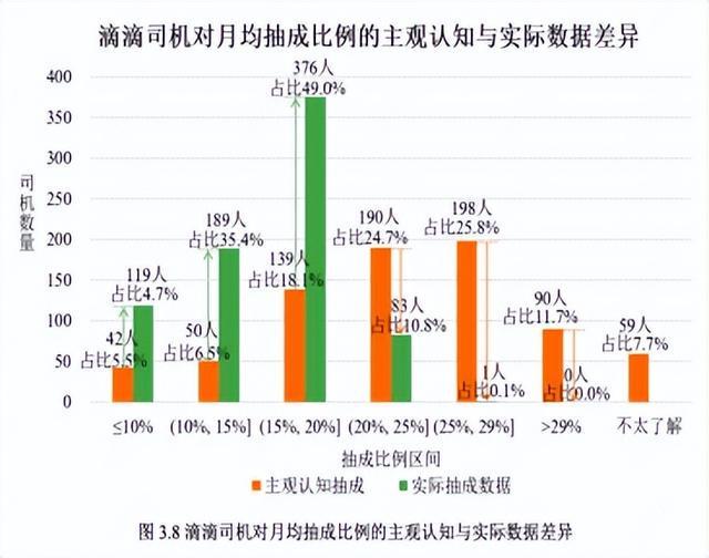 調(diào)研發(fā)現(xiàn),71.8%的滴滴司機高估了抽成比例。超三分之一的司機誤認為月均抽成高于25%,但以拍照留存的數(shù)據(jù)驗證,768位司機中僅有1人月均抽成超過25%。