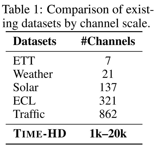 然而,當(dāng)前主流的時(shí)間序列預(yù)測(cè)(TSF)模型,大多仍停留在僅包含幾個(gè)或幾百個(gè)變量的低維環(huán)境中進(jìn)行評(píng)估(Table 1)。
