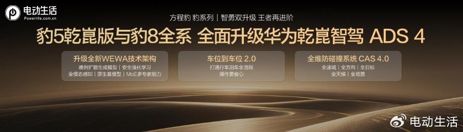 豹5乾崑版及豹8全系將升級華為乾崑智駕ADS 4,實現了從類人駕駛到超人駕駛的重大升級。首先,升級全新WEWA技術架構,讓輔助駕駛可以云端自主學習進化,越用越絲滑;車位到車位功能也升級至2.0版本,打通了行車到泊車的全流程,全程銜接無縫,操作更省心;此外,還有全維防碰撞系統CAS 4.0,可以覆蓋全路況、全天候,安全制動更快更靈敏,讓長途駕駛不再疲憊,讓城市通勤安全又輕松。