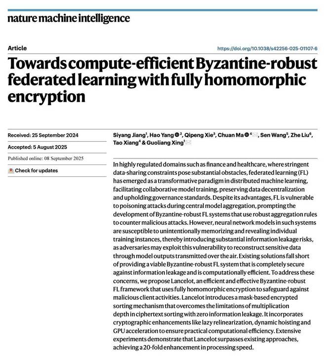 金融、醫療等高度敏感的應用場景中,拜占庭魯棒聯邦學習(BRFL)能夠有效避免因數據集中存儲而導致的隱私泄露風險,同時防止惡意客戶端對模型訓練的攻擊。然而,即使是在模型更新的過程中,信息泄露的威脅仍然無法完全規避。為了解決這一問題,全同態加密(FHE)技術通過在密文狀態下進行安全計算,展現出保護隱私信息的巨大潛力。