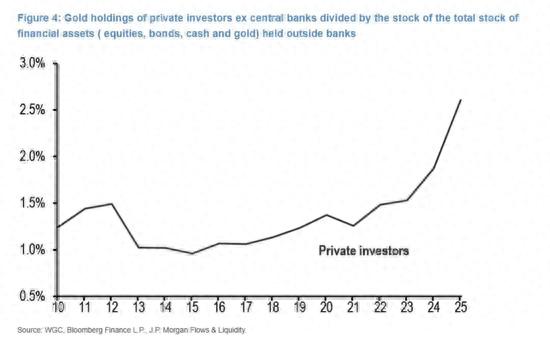 這與摩根大通由尼古拉奧斯·帕尼吉佐格魯(Nikolaos Panigirtzoglou)牽頭的策略師團(tuán)隊(duì)給出的“今日核心觀點(diǎn)”一致:隨著投資者越來(lái)越多地將黃金用作股票對(duì)沖工具,未來(lái)三年金價(jià)可能上漲逾一倍。