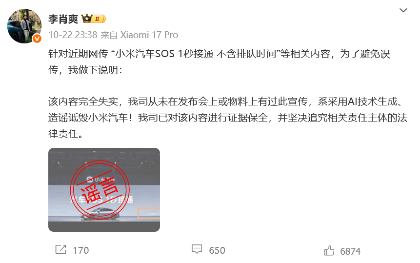 小米汽車副總裁李肖爽,在微博上發文辟謠,表示小米從未進行過此宣傳,這是由AI生成的造謠圖片。并且小米已經“對該內容進行證據保全,并堅決追究相關責任主體的法律責任。 ”