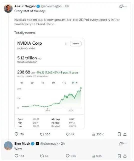 一位網(wǎng)友在社交平臺X上轉(zhuǎn)發(fā)了英偉達市值一度突破5.1萬億美元的截圖,特斯拉CEO埃隆·馬斯克也不盡發(fā)出贊嘆之聲。