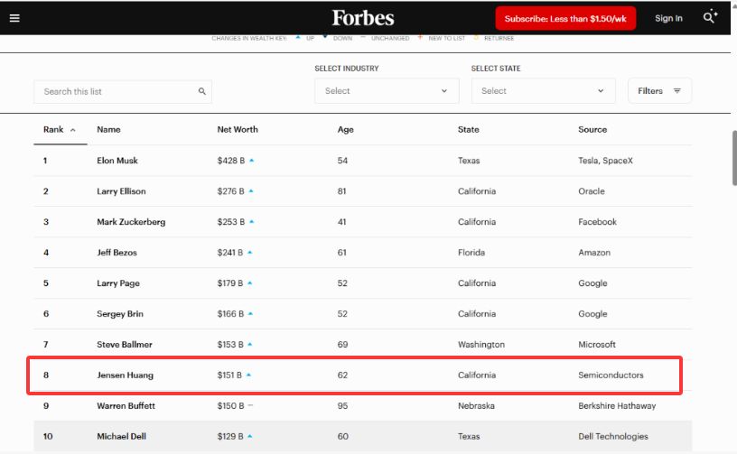 隨著英偉達股價的大幅上漲,福布斯實時富豪榜顯示,黃仁勛的個人財富上升至福布斯富豪榜第八位。