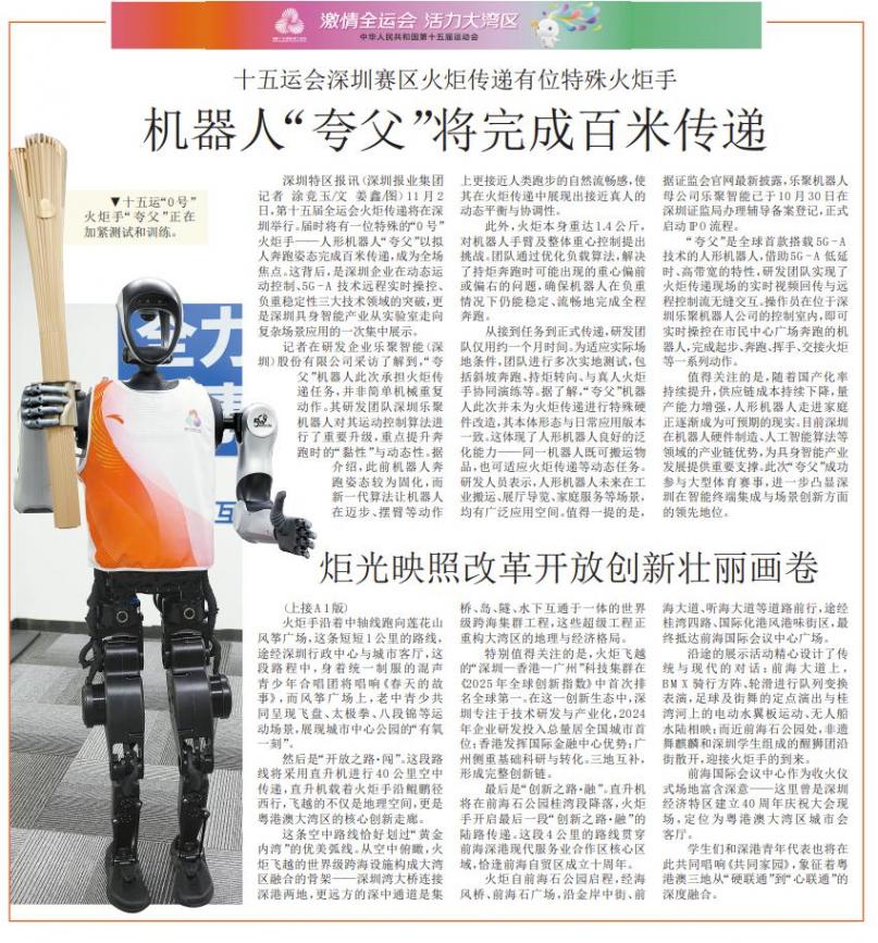 11月2日,第十五屆全運會火炬傳遞將在深圳舉行。屆時將有一位特殊的“0號”火炬手——人形機器人“夸父”以擬人奔跑姿態完成百米傳遞,成為全場焦點。這背后,是深圳企業在動態運動控制、5G-A技術遠程實時操控、負重穩定性三大技術領域的突破,更是深圳具身智能產業從實驗室走向復雜場景應用的一次集中展示。