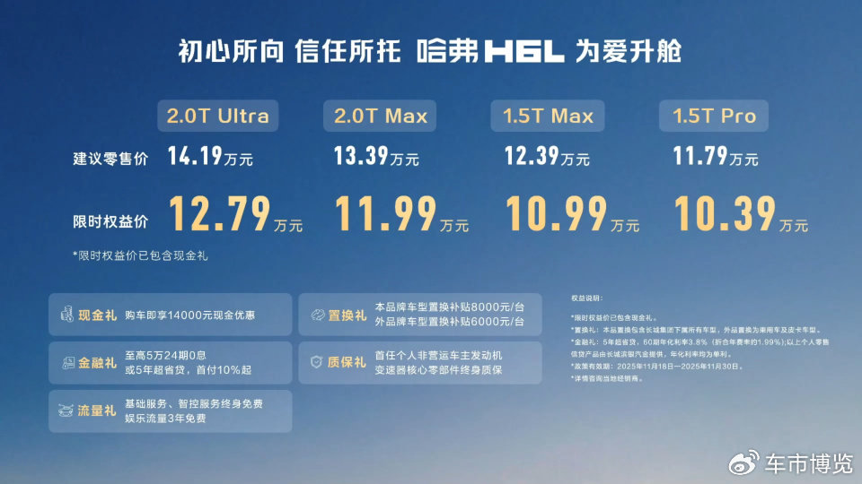 不到13萬(wàn)就能買到一個(gè)頂配的2.0T+9DCT 中型SUV, 把都市SUV 價(jià)格打下來(lái)了;11月18日,正式上市,此次新車共推出4款車型,指導(dǎo)價(jià)格區(qū)間為11.79萬(wàn)元-14.19萬(wàn)元,限時(shí)權(quán)益價(jià)10.39萬(wàn)元-12.79萬(wàn)元。此次發(fā)布會(huì)上,知名主持人、哈弗產(chǎn)品體驗(yàn)官李思思親臨現(xiàn)場(chǎng)并深入探訪長(zhǎng)城汽車研發(fā)驗(yàn)證體系,共同見(jiàn)證哈弗H6L以全球統(tǒng)一的高標(biāo)準(zhǔn)品質(zhì),開啟"為愛(ài)升艙"的全新篇章。